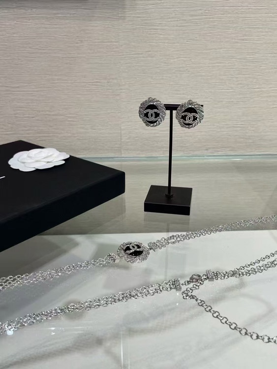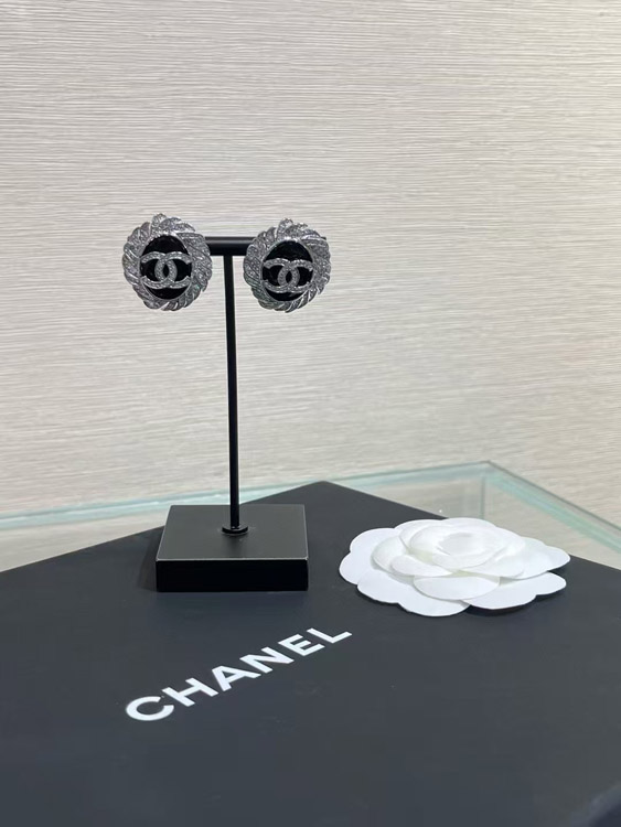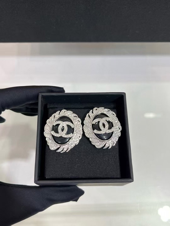 Celine black oval button silver full diamond double C earrings-3900